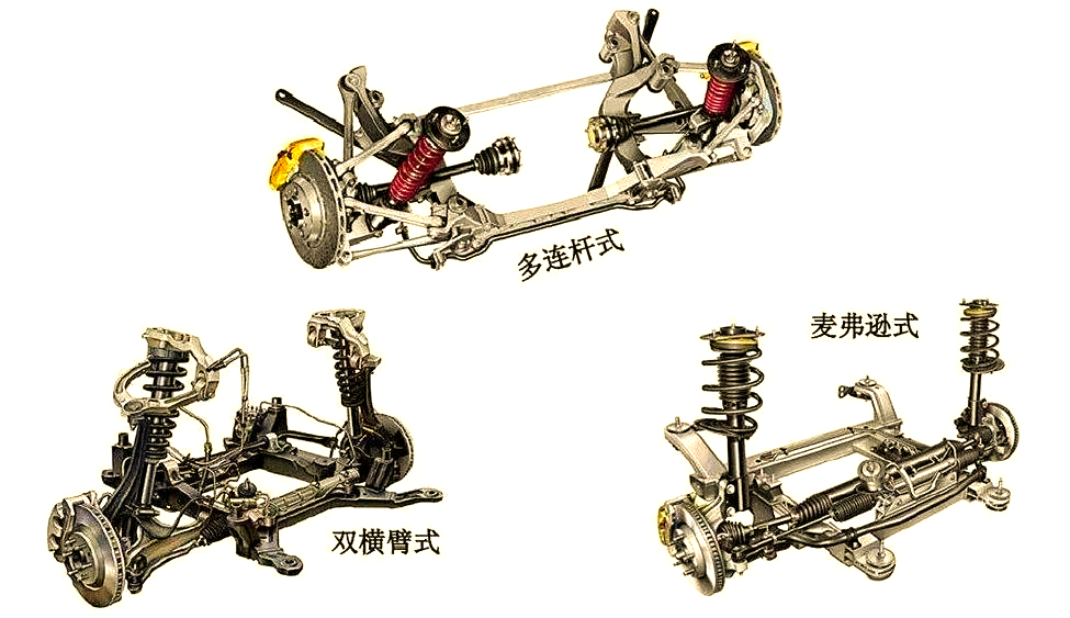 独立悬架:左右车轮通过各自独立的悬架系统连接,互不干扰。常见类型包括麦弗逊式、双叉臂式和多连杆式。