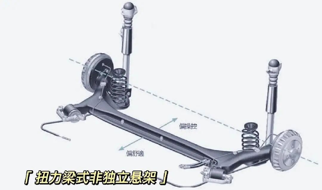 非独立悬架:左右车轮通过一根整体车桥连接,一侧车轮的运动会影响另一侧。典型代表是扭力梁式悬架。
